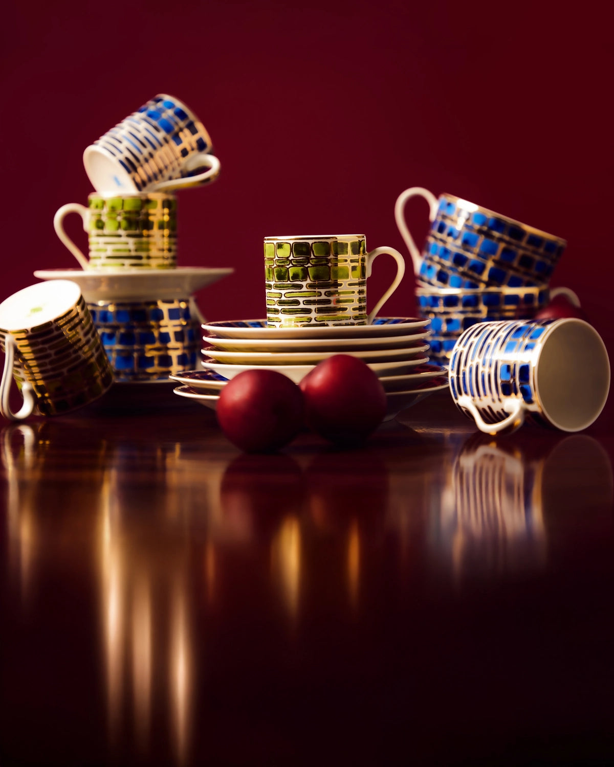 Born from Brazil's modernist spirit, Bossa Bleu unites precise geometry with the brilliance of platinum, crafted in Limoges to bring harmony, rhythm, and contemporary artistry to the table.