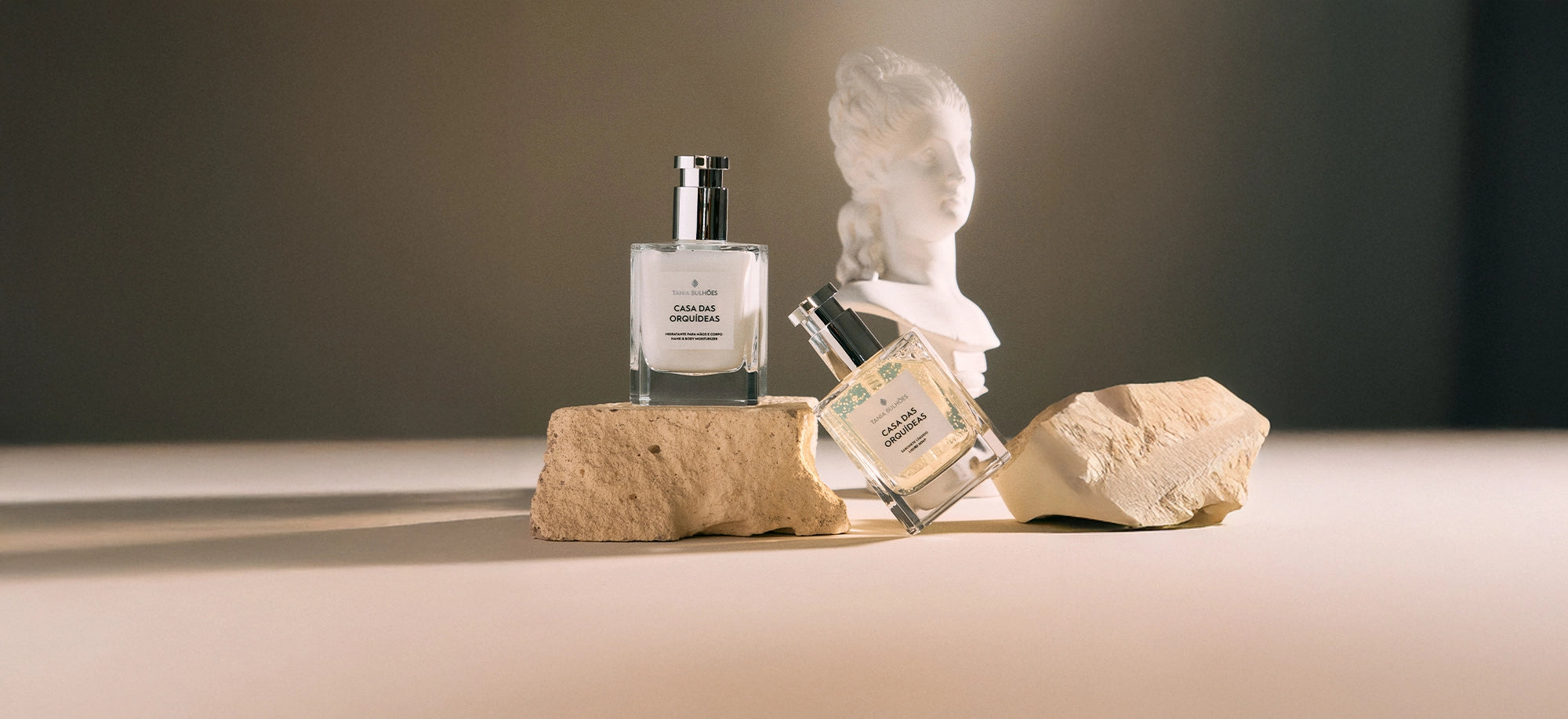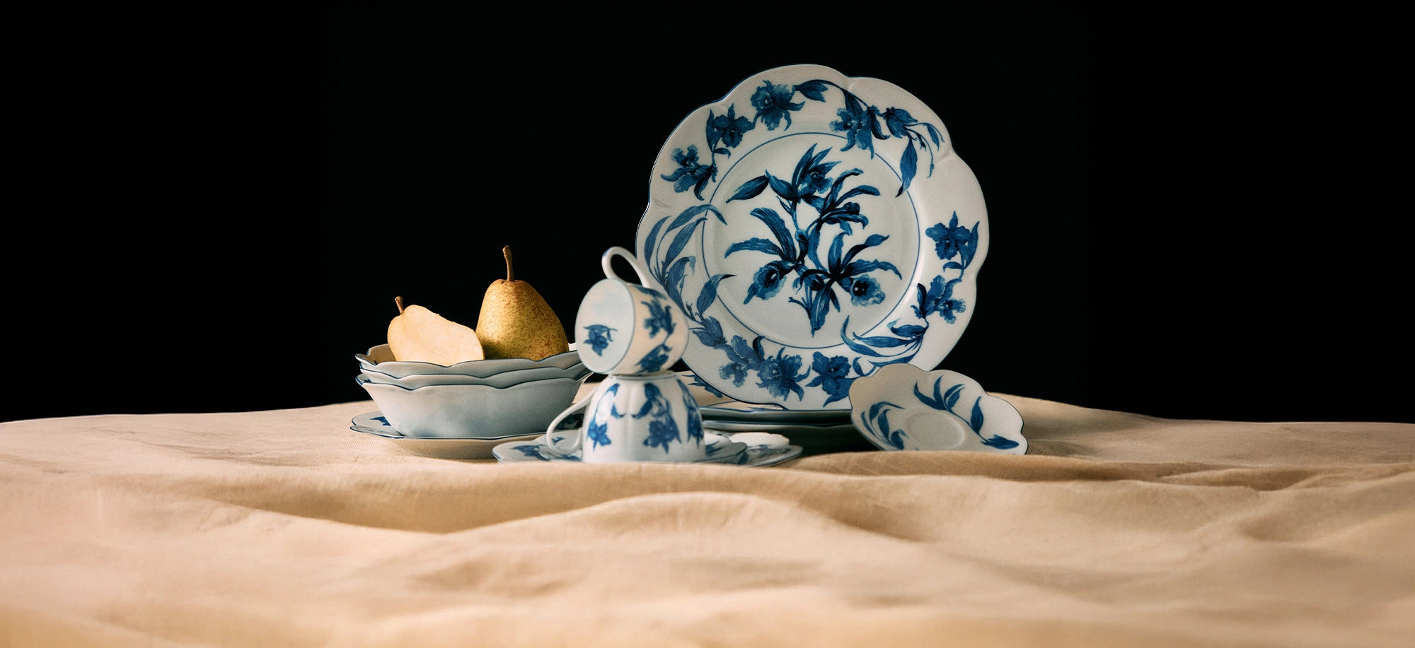 The Casa das Orquideas collection is made with Limoges porcelain and delicate orchid paintings that range from dark blue to light turquoise, bringing freshness and life to the table.